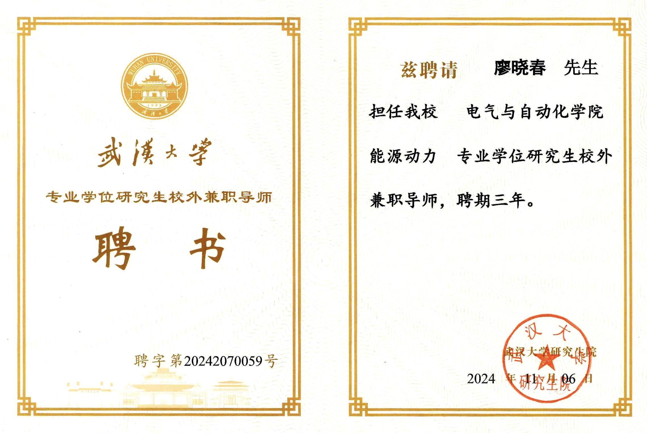 2025 年5 月8 日,武汉大学电气与自动化学院向我司廖晓春先生颁发聘书,聘任廖晓春先生为武汉大学电气与自动化学院能源动力专业研究生校外兼职导师,聘期3 年